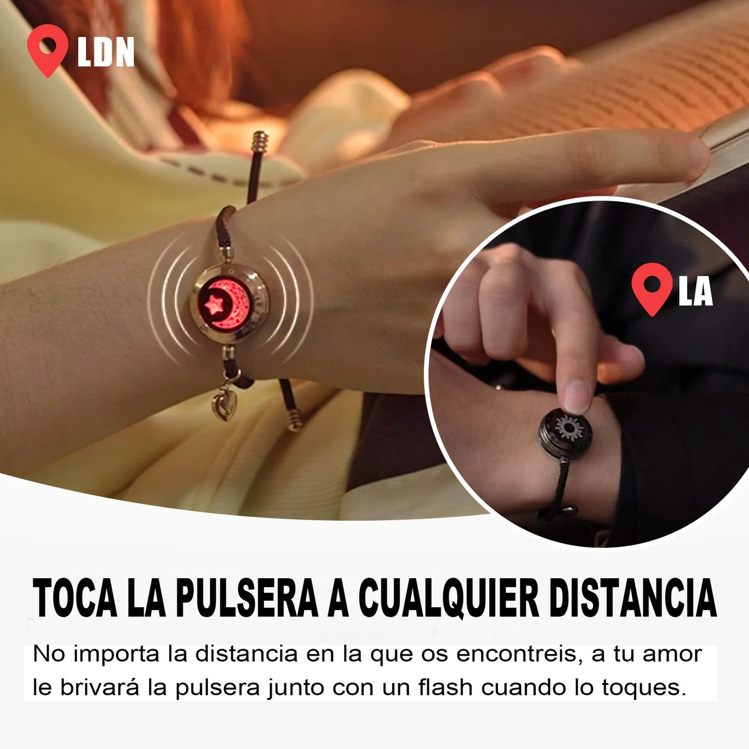 Desde Londres hasta Los Ángeles, un solo toque ilumina y vibra tu pulsera, recordándote que vuestro vínculo es más fuerte que cualquier kilómetro.