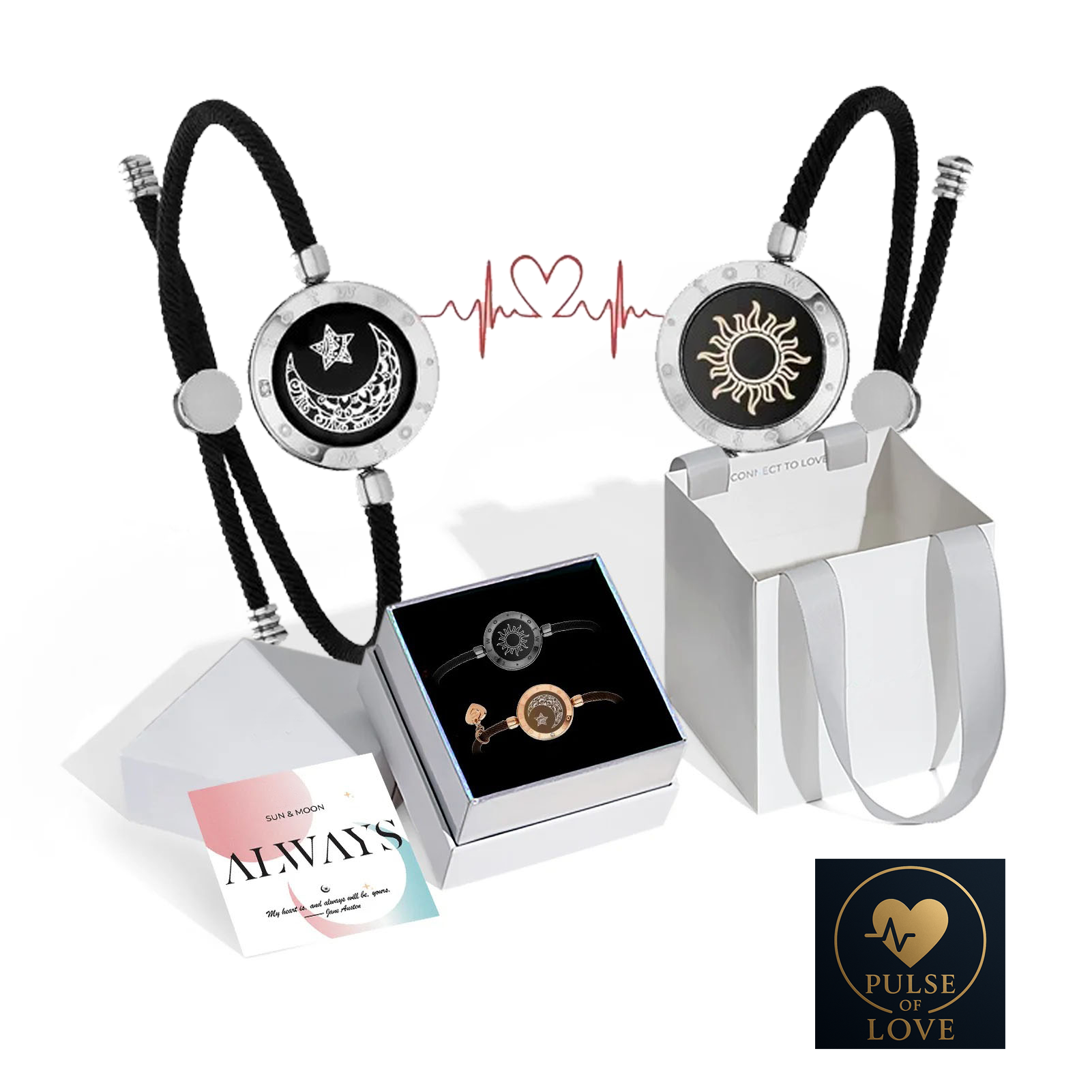 Cada set Pulse of Love incluye dos pulseras de lujo, empaquetadas en una elegante caja regalo con bolsa exclusiva y tarjeta personalizada.