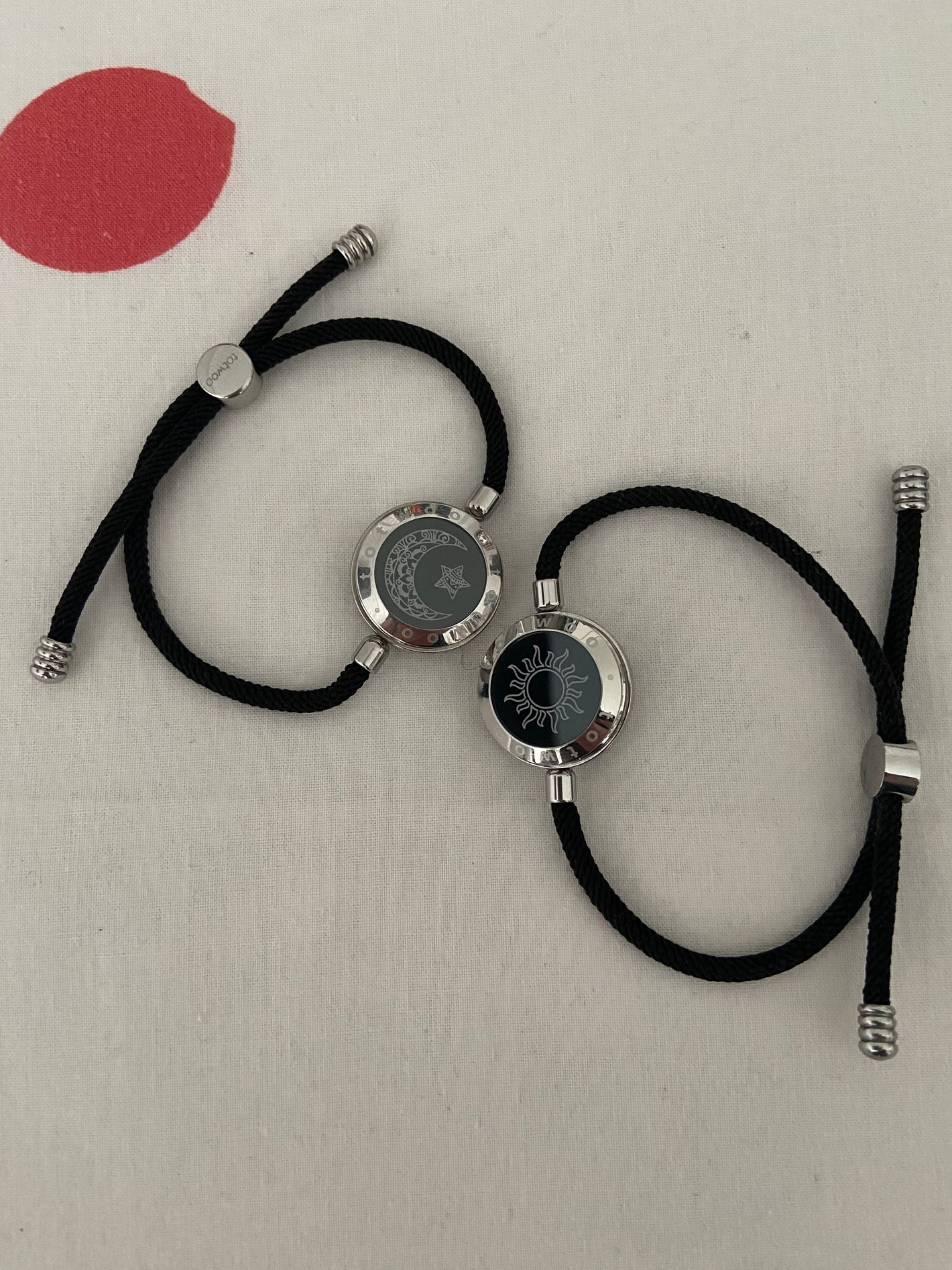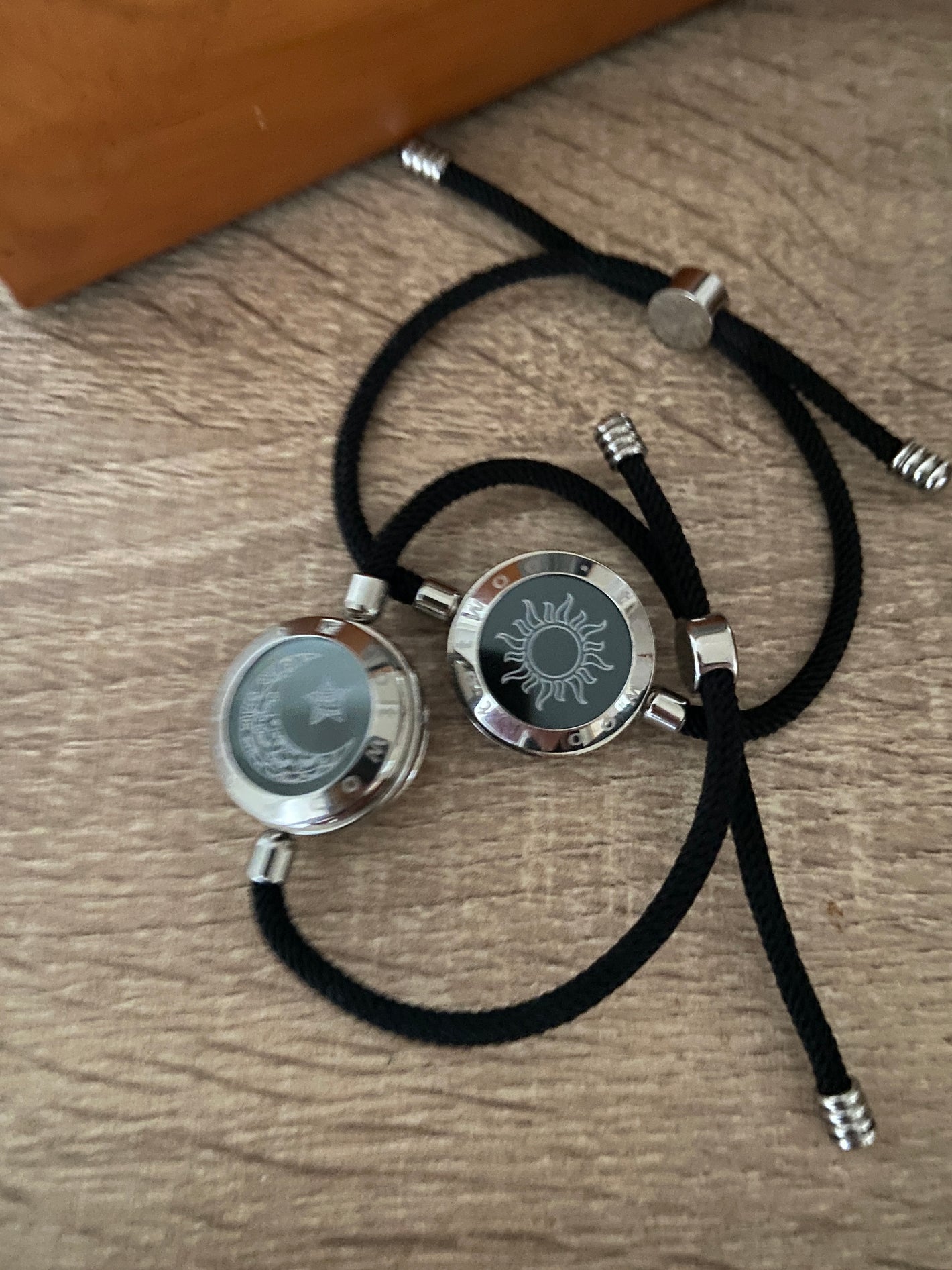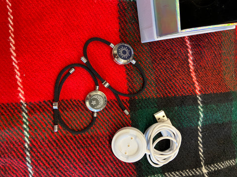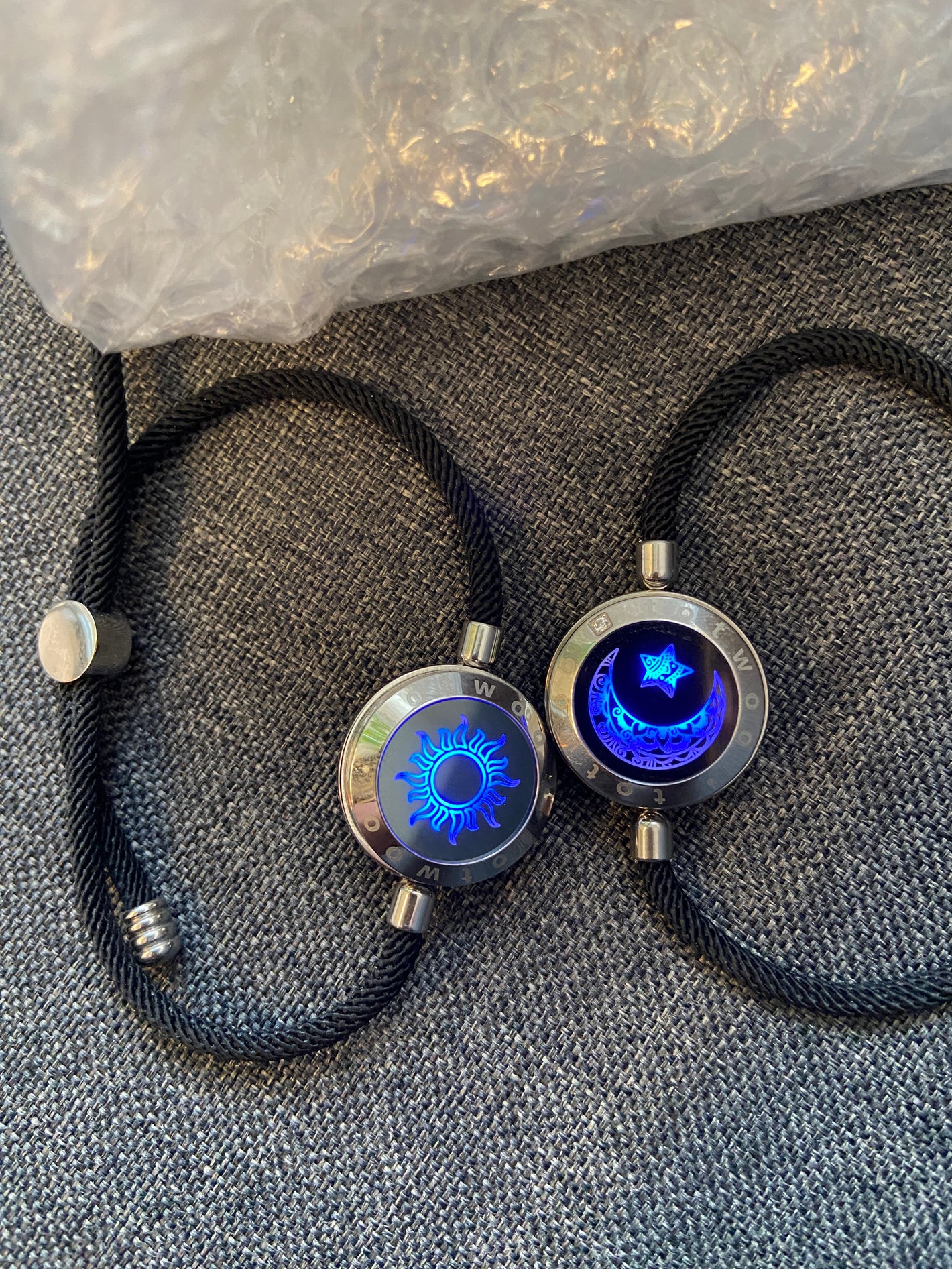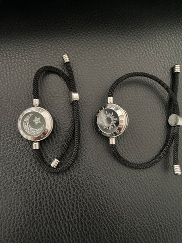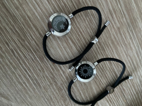 Son dos pulseras de acero y cordón de alta resistencia. Con un dibujo de Sol y Luna. que cambia de color a demanda del usuario. Así como la duración de la vibración. Y los extras los tienes disponibles en los botones de selección del producto