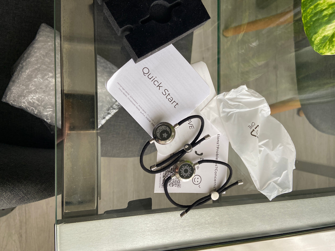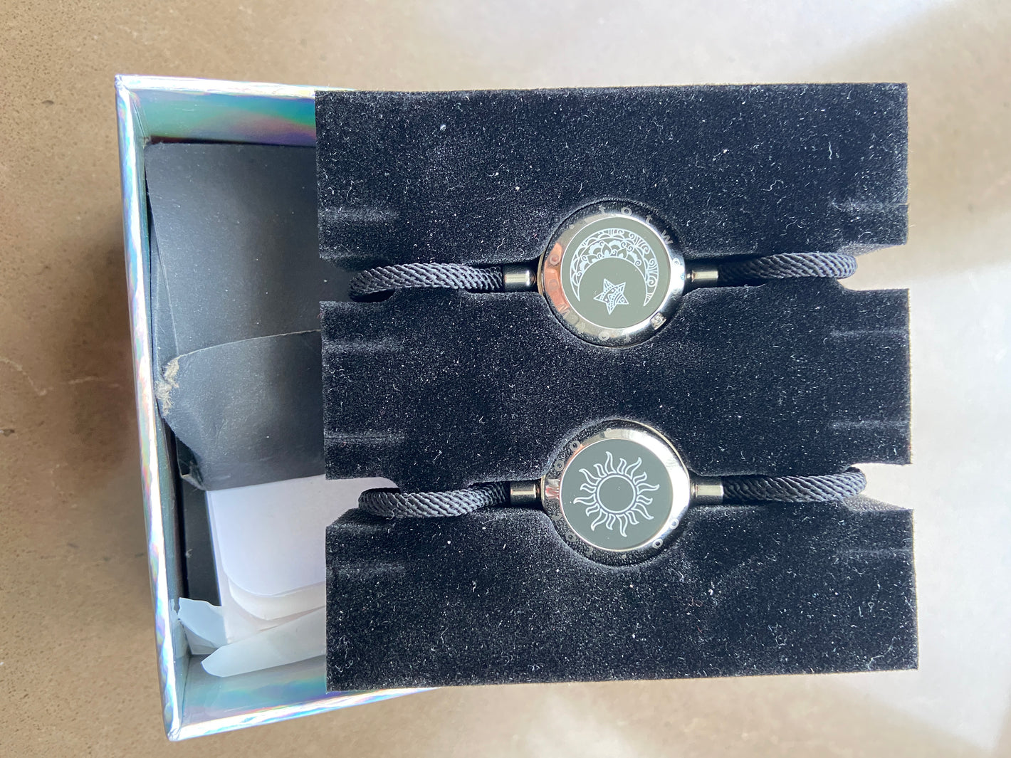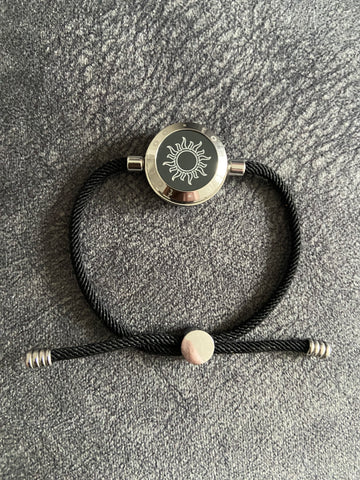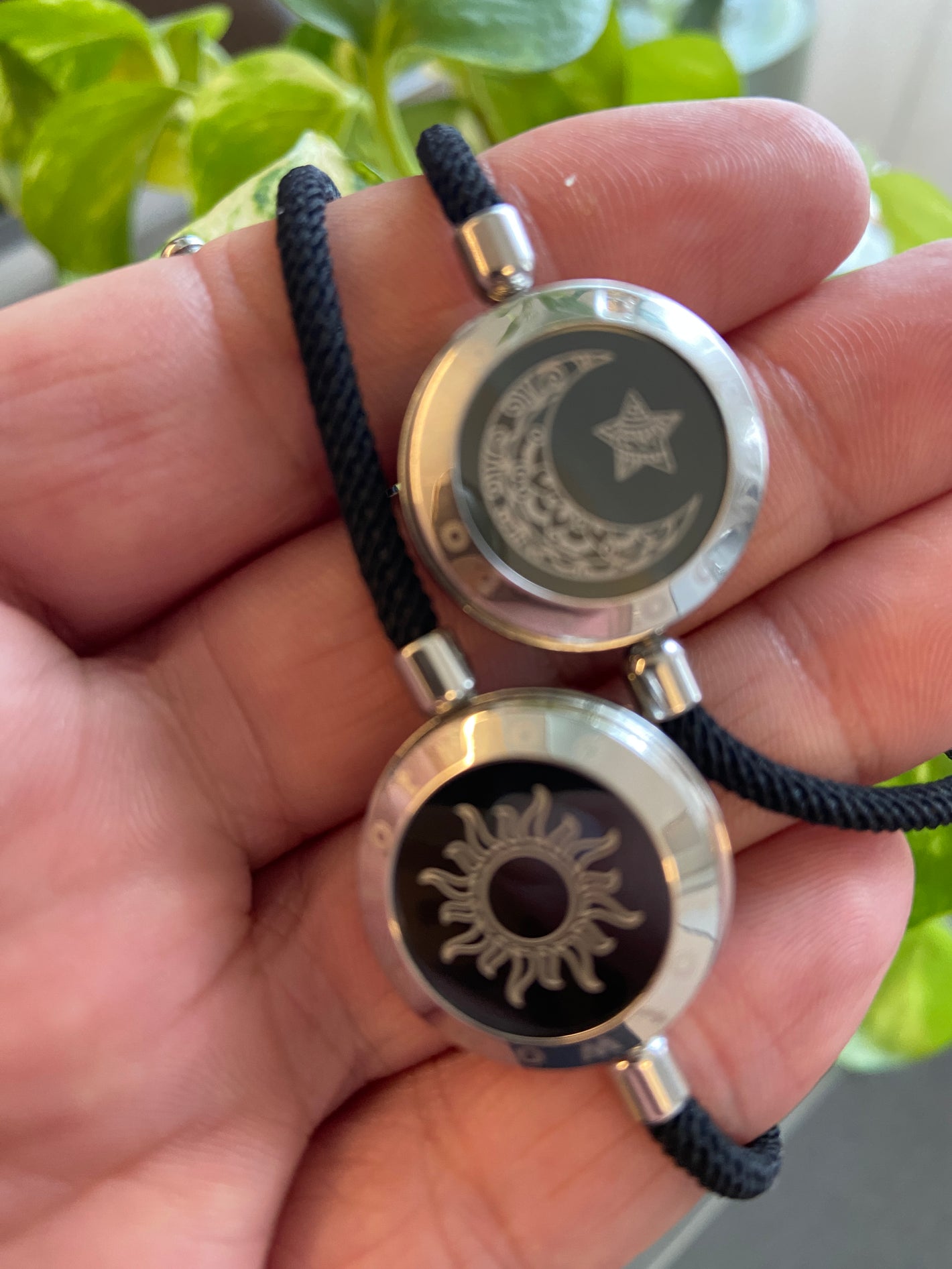 Son dos pulseras de acero y cordón de alta resistencia. Con un dibujo de Sol y Luna. que cambia de color a demanda del usuario. Así como la duración de la vibración. Y los extras los tienes disponibles en los botones de selección del producto